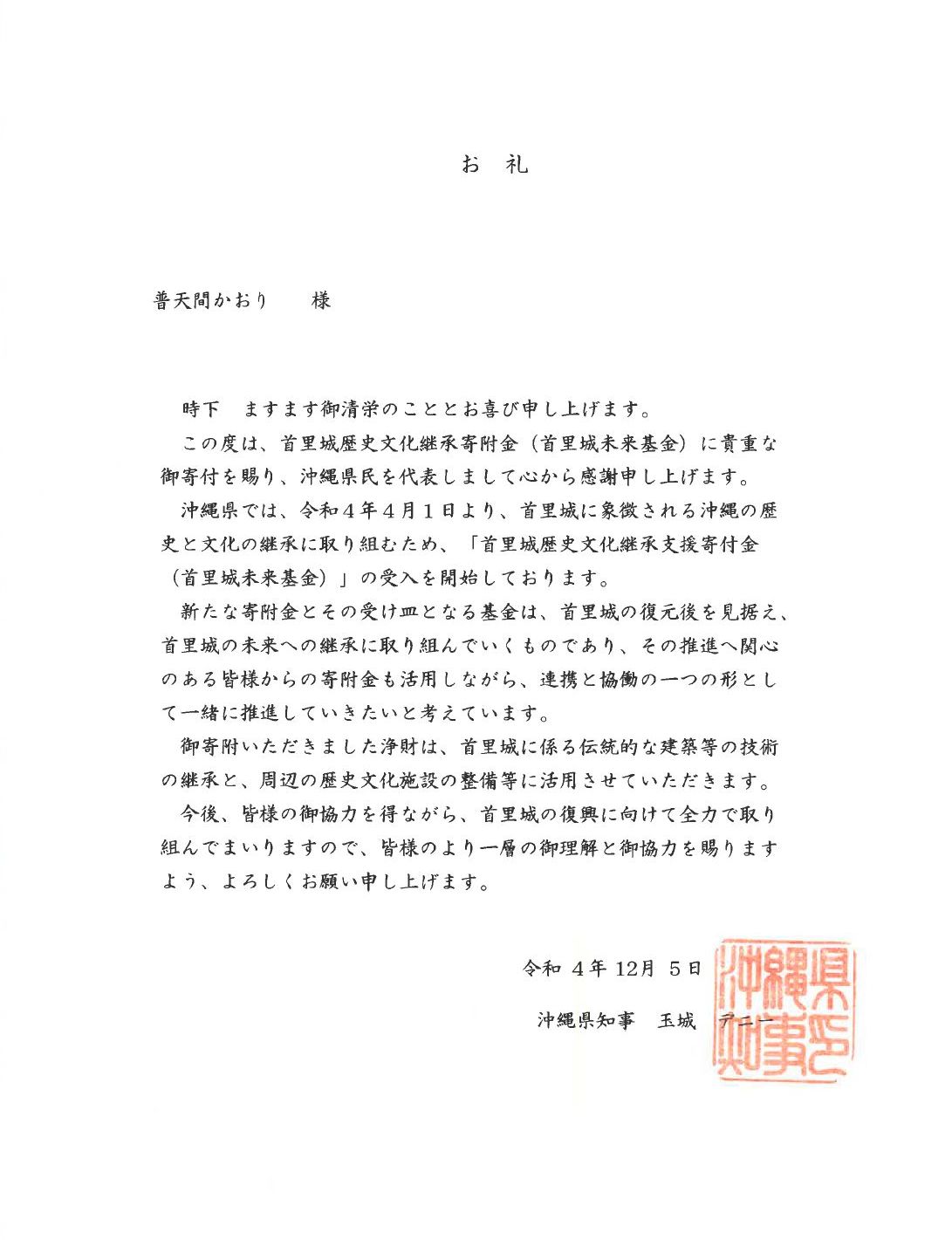 沖縄県 玉城知事よりお礼状を頂きました → こちら