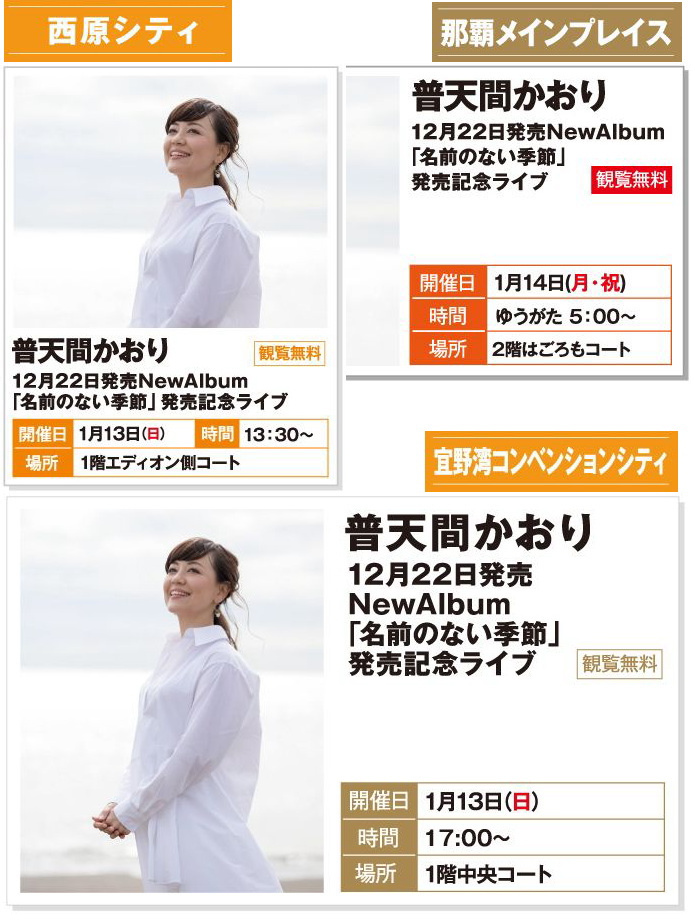 | 1月20日(日) 普天間かおりコンサート2019 NewAlbum発売記念コンサート |