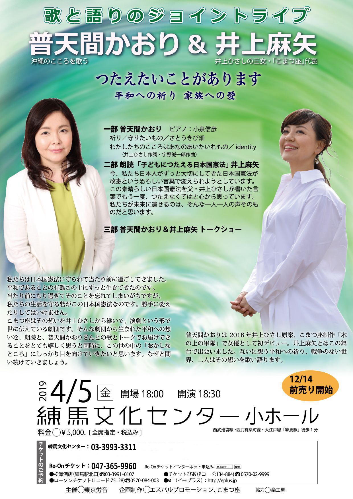 | 12月1日(日) 東京文化会館 普天間かおりコンサート2019 ~いのち、つむぐ、うた~ |